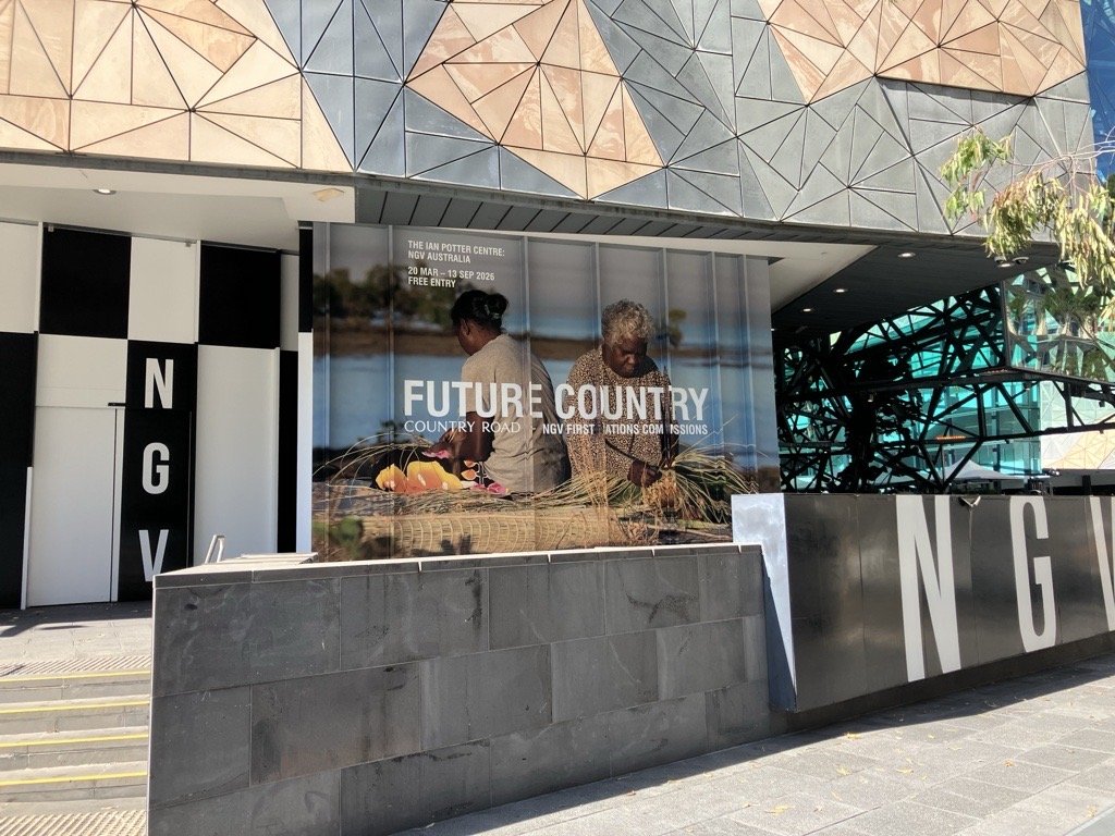 A photograph of artists Doreen Jinggarrabarra and Stephanie Ali in ManingridaI is now being used in outdoor display in Melbourne to promote the upcoming NGV x Country Road: FUTURE COUNTRY 2026 project. You can see it on the exit wall at NGV International and the external facade of the studio at NGV Australia over at Fed Square.